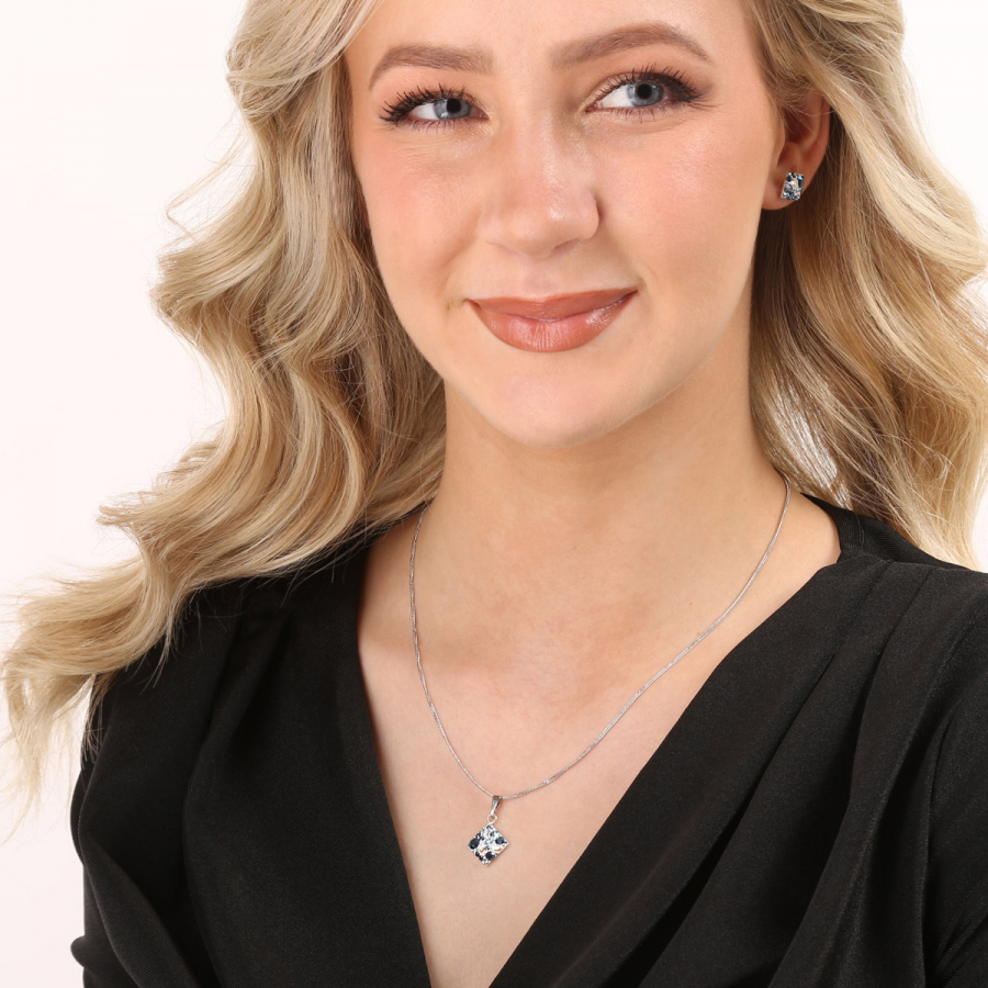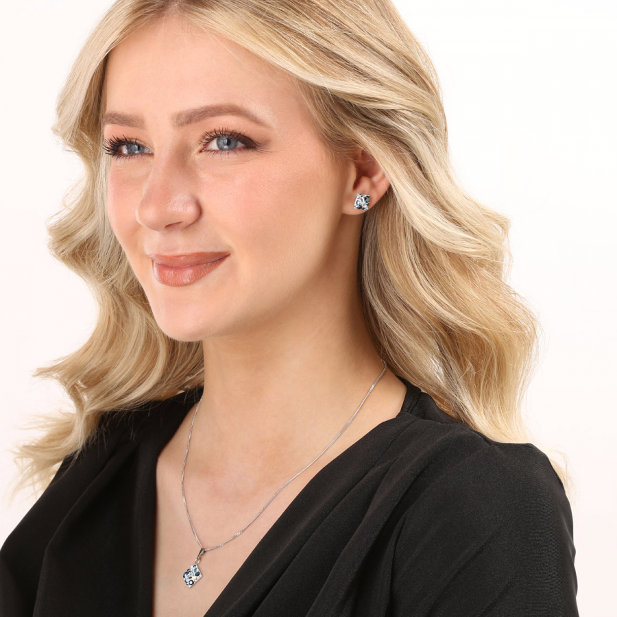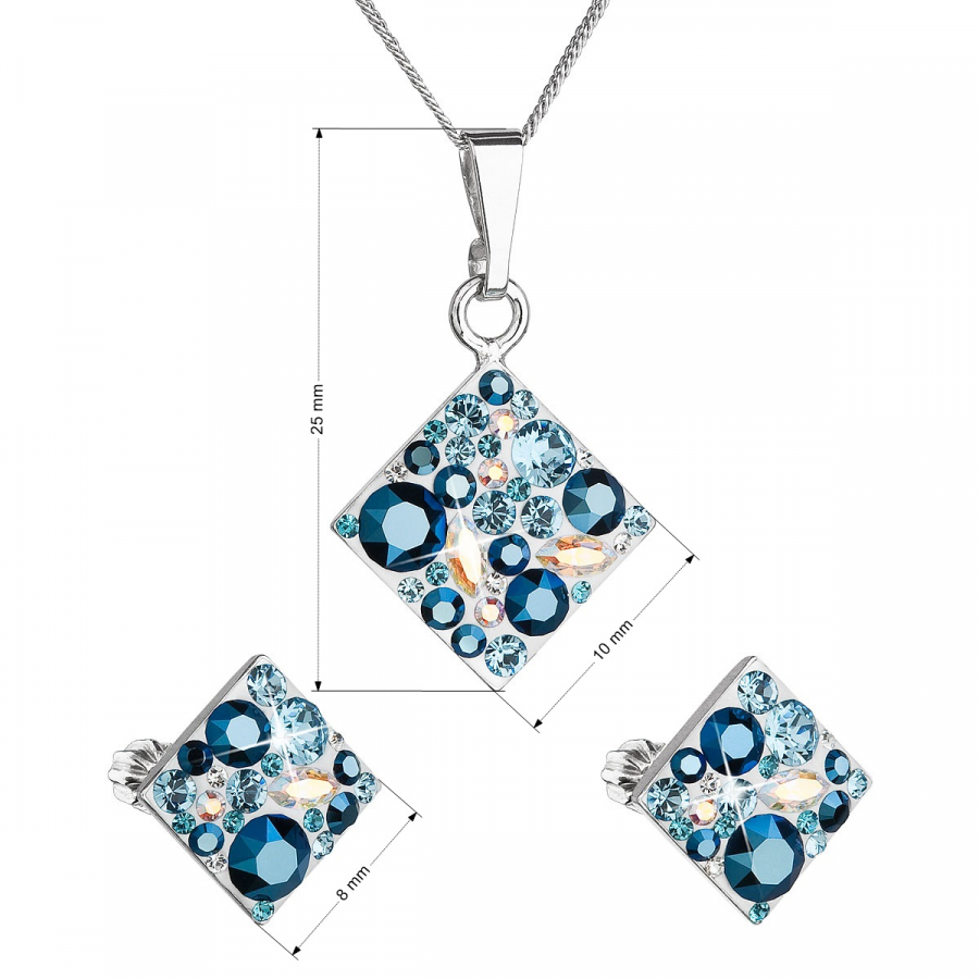 Sada šperkov 39126.3 aqua obsahuje náušnice kôstky a retiazku s príveskom. Šperky sú v tvare kosoštvorca a sú vyrobené zo striebra rýdzosti 925/1000, ktoré prešlo povrchovou úpravou ródiom. Ródium chráni šperk proti sčerneniu, zožltnutiu i poškriabaniu. Prívesok aj náušnice sú bohato zdobené trblietavými Swarovski kryštálmi v rôznych farbách. Náušnice majú zapínanie na balónik. Keďže šperky neobsahujú žiadny prídavok niklu , môžu ich bez obáv nosiť aj alergici.