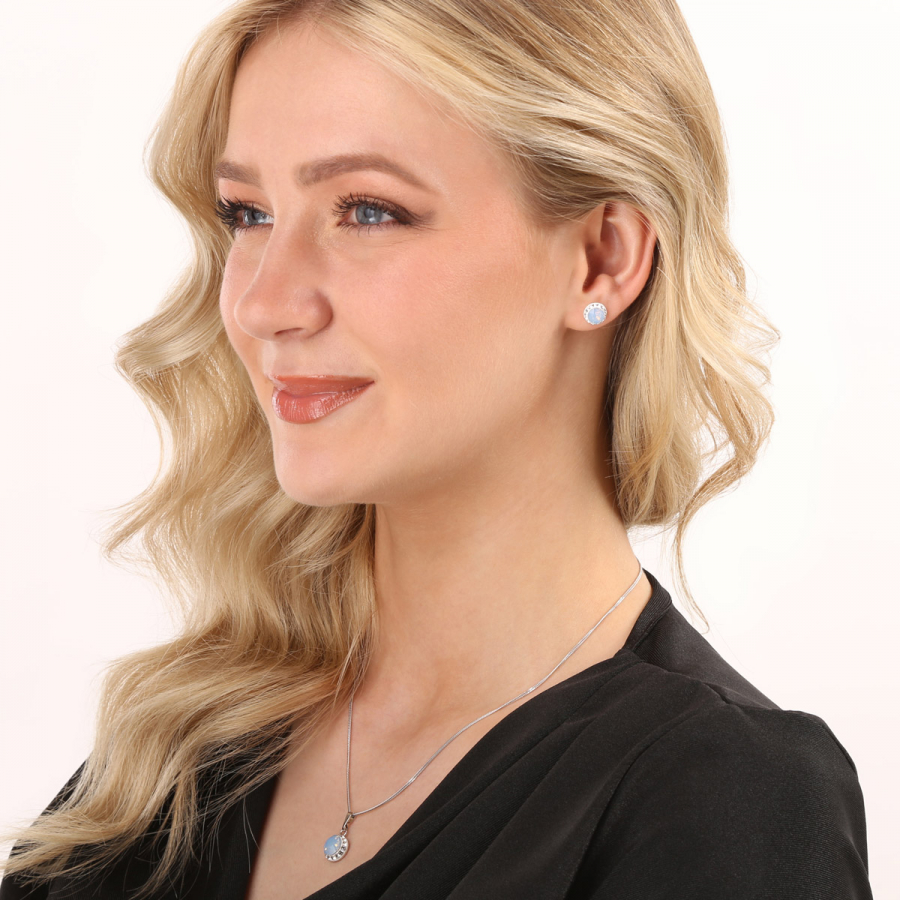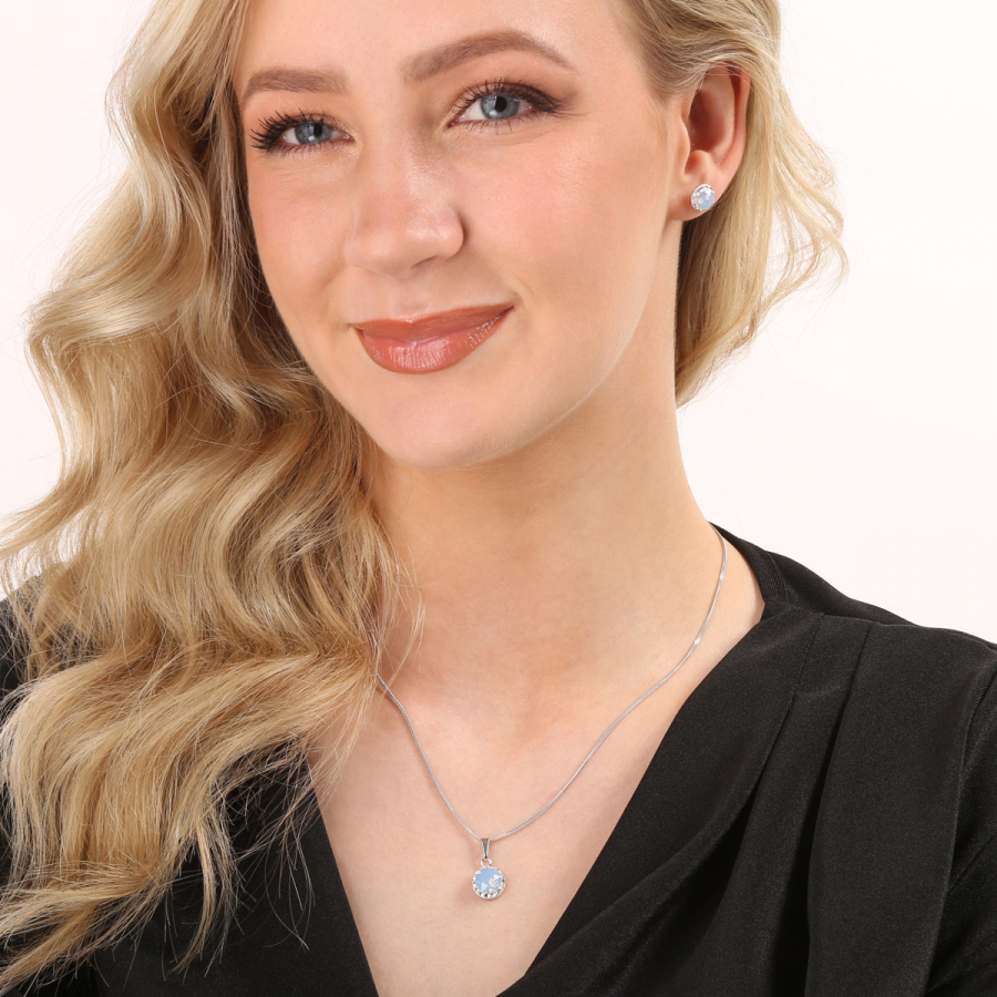 Sada 39352.7 obsahuje náušnice kôstky a retiazku s príveskom. Šperky sú vyrobené zo striebra rýdzosti 925/1000, ktoré prešlo povrchovou úpravou ródiom. Ródium chráni šperk proti sčerneniu, zožltnutiu i poškriabaniu. Prívesok aj náušnice sú zdobené okrúhlym Swarovski kryštálom vo farbe modrého opálu , ktorý je navyše olemovaný ešte malými trblietavými Swarovski kryštálmi v bielej farbe. Náušnice majú zapínanie na spoľahlivý balónik. Keďže šperky neobsahujú žiadny prídavok niklu , môžu ich bez obáv nosiť aj alergici.