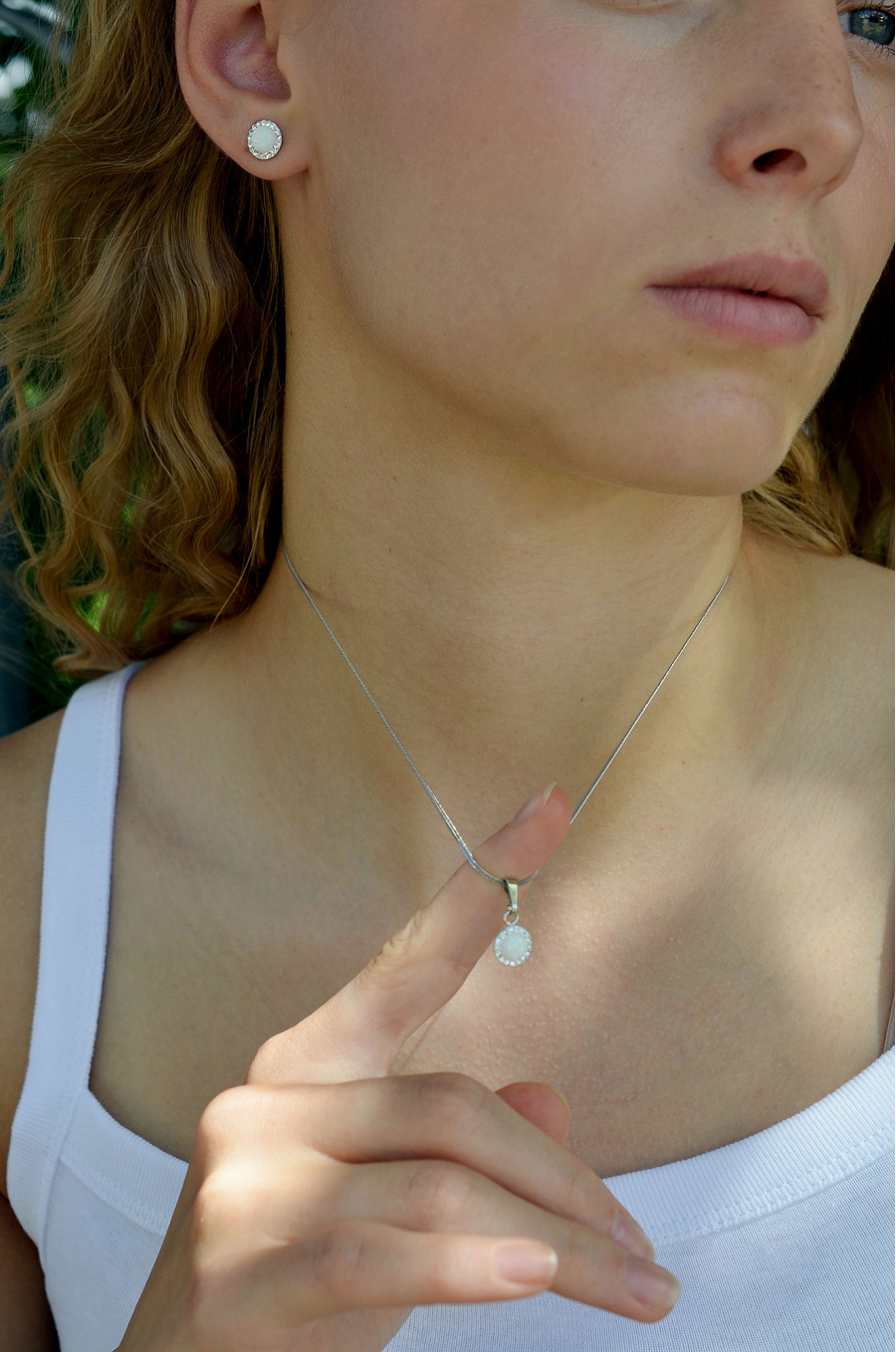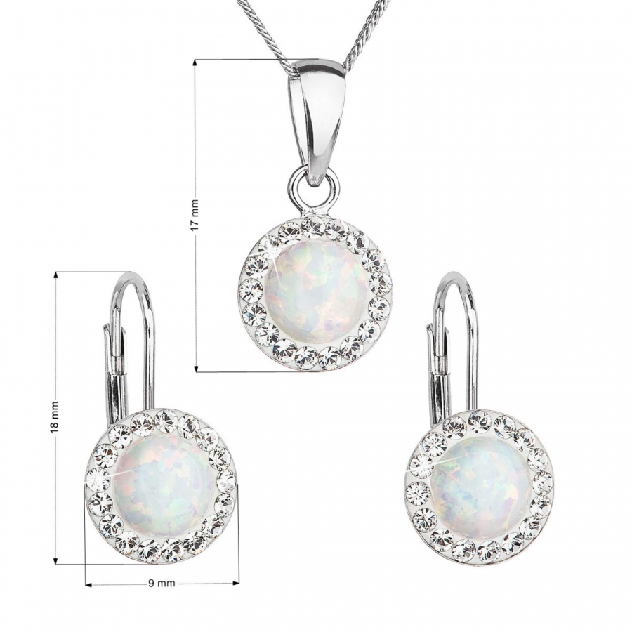 Sada 39160.1 obsahuje visiace náušnice a retiazku s príveskom. Šperky sú vyrobené zo striebra rýdzosti 925/1000, ktoré prešlo povrchovou úpravou ródiom. Ródium chráni šperk proti sčerneniu, zožltnutiu i poškriabaniu. Prívesok aj náušnice sú zdobené bielym syntetickým opálom , ktorý je navyše olemovaný malými trblietavými Preciosa kryštálmi v bielej farbe. Náušnice majú zapínanie na klapku. Keďže šperky neobsahujú žiadny prídavok niklu , môžu ich bez obáv nosiť aj alergici.