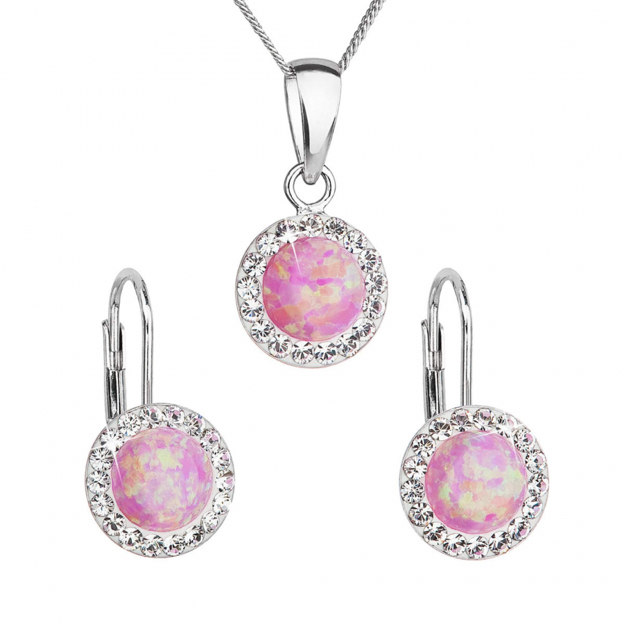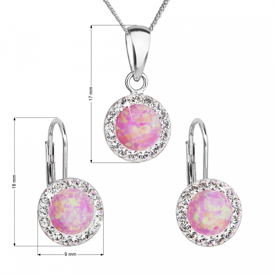 Sada 39160.1 obsahuje visiace náušnice a retiazku s príveskom. Šperky sú vyrobené zo striebra rýdzosti 925/1000, ktoré prešlo povrchovou úpravou ródiom. Ródium chráni šperk proti sčerneniu, zožltnutiu i poškriabaniu. Prívesok aj náušnice sú zdobené ružovým syntetickým opálom , ktorý je navyše olemovaný malými trblietavými Preciosa kryštálmi v bielej farbe. Náušnice majú zapínanie na klapku. Keďže šperky neobsahujú žiadny prídavok niklu , môžu ich bez obáv nosiť aj alergici.