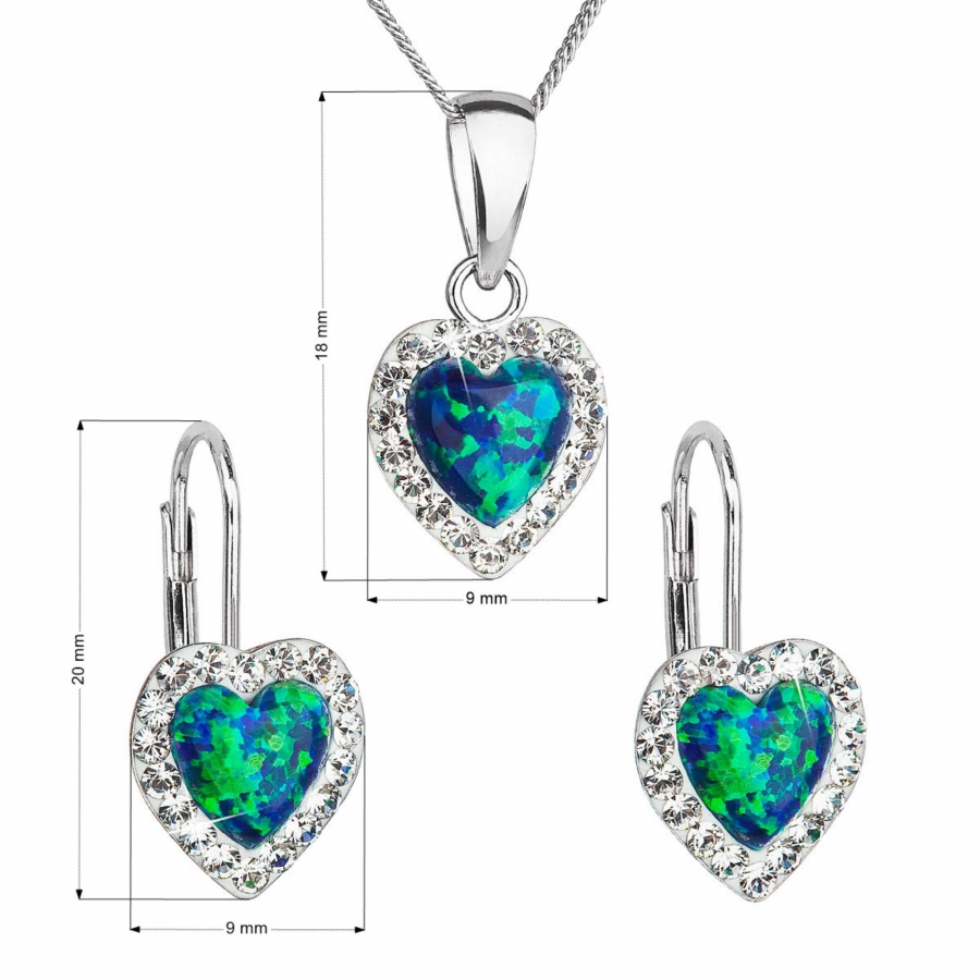 Parametre sady šperkov so syntetickým opálom a kryštálmi Preciosa náušnice a prívesok zelené srdce 39161.1